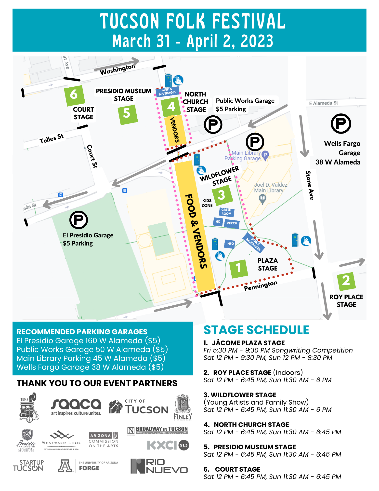 These locations are subject to change, so be sure to check the Tucson Folk Festival website before the event if it's important to you to know where each stage is.